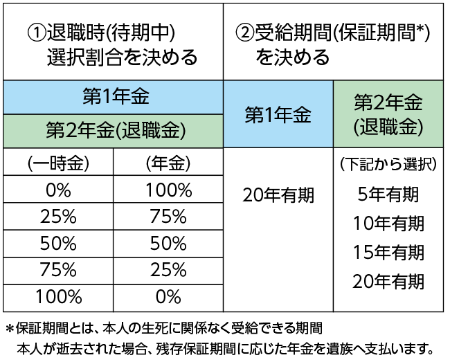 退職時に一時金を受け取っていない場合、第1年金、第2年金を、原資残の全部又は一部を一時金(退職所得扱い)として受給することができます。