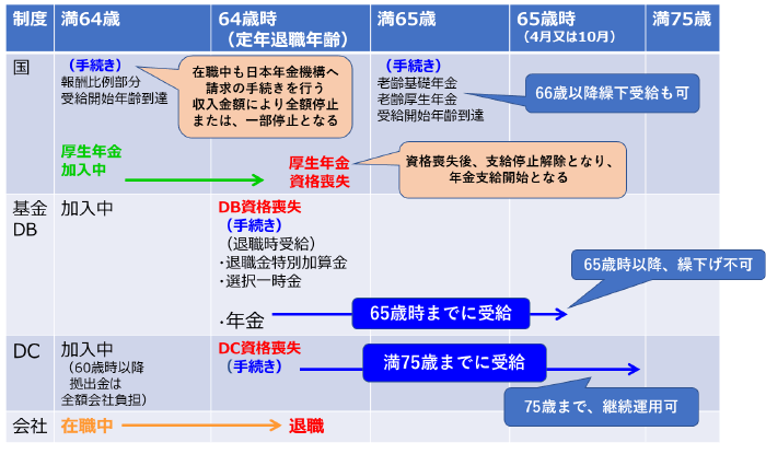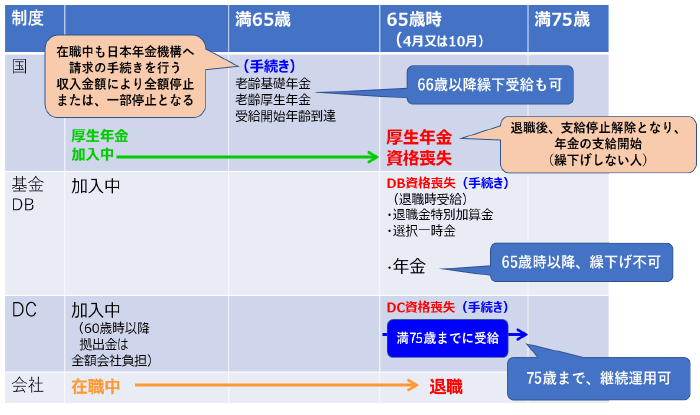 基金(DB)、DC、国の年金の手続きの時期は以下を参照ください。