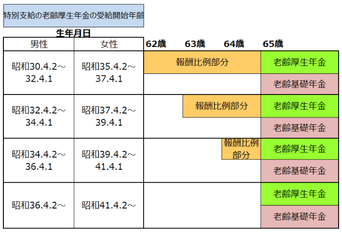 特別支給の老齢厚生年金(報酬比例部分)の受給開始年齢は、以下を参照ください。
